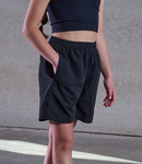 100% polyester microfibre. Peached finish. Elasticated waistband with inner drawcord. Mesh lining inner shorts. Two side pockets. Unbranded, size tab only in waist.